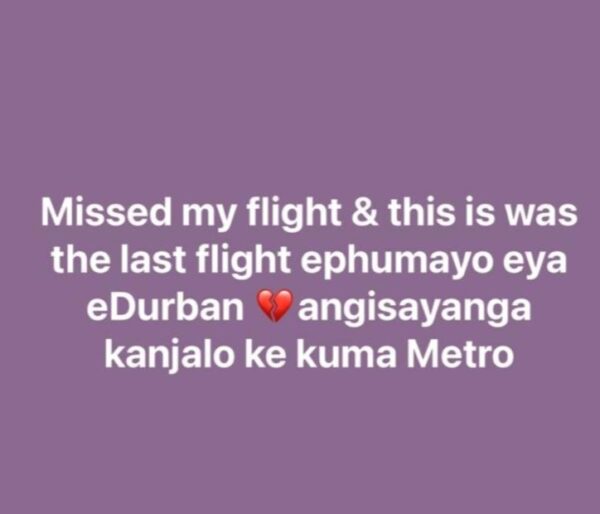 “Missed my flight and this is the last flight ephumayo eya eDurban angisayanga Kanjalo ke kuma Metro,” she wrote.